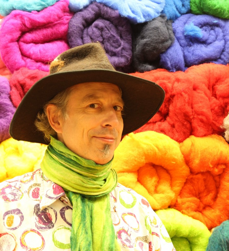 Wir fertigen dünne Schals aus superfeiner Kammzugwolle (16mic Melange) ohne Seidenstoff als Trägermaterial. Wer möchte kann Fasermaterial, Stoffreste oder Garne miteinfilzen. Ausgelegt wird die Wolle nur in einer Faserrichtung (Monofilz). Der Schal und die Farben sind wunderschön und beeindruckend.