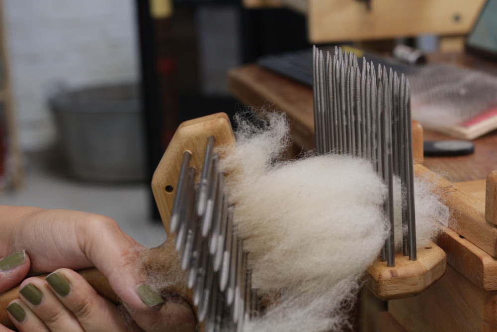 Die TeilnehmerInnen lernen den Umgang mit Wollkämmen und Handkarden und somit
