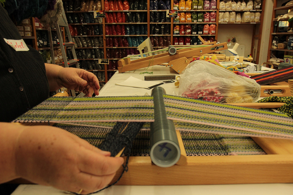 Ingrid Frank bringt Garne zum Weben (zum Kaufen) und sämtliche Webrahmen zum kostenlosen Ausleihen oder für das spätere Erwerben mit.