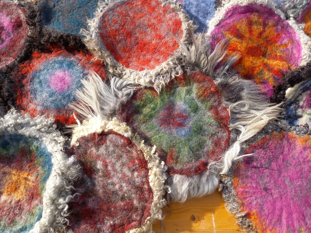 Die Sitzfelle können je nach Bedarf auf der Rückseite auch mit gefärbter Wolle gefilzt werden. So entstehen wunderschöne künstlerische Wendekissen.