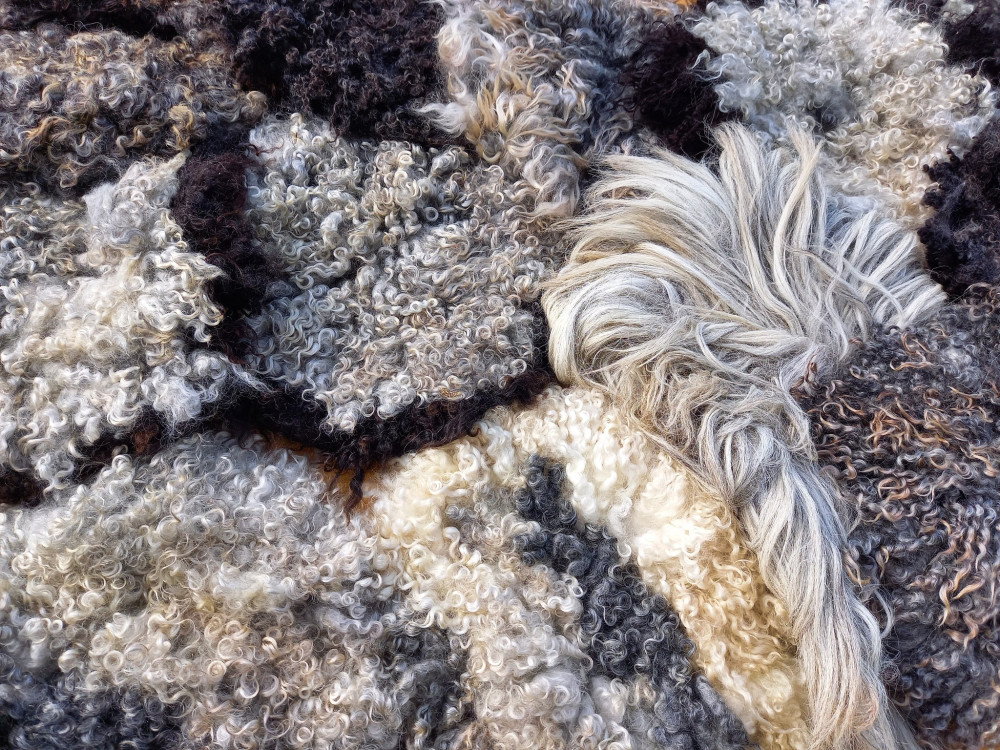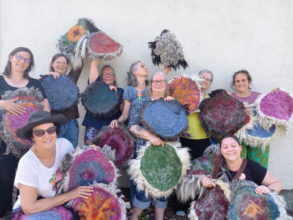 Wer möchte kann gerne eigene Wolle mitbringen. Achtet bitte bei der Schur, dass die Wolle möglichst am Stück geschoren wurde. Sollte das nicht der Fall sein können mehrere kleinere Strücke auch zusammengelegt werden. Bei dieser Technik wird auf die Rückseite Wolle aufgefilzt, die den Grundhalt gibt.
