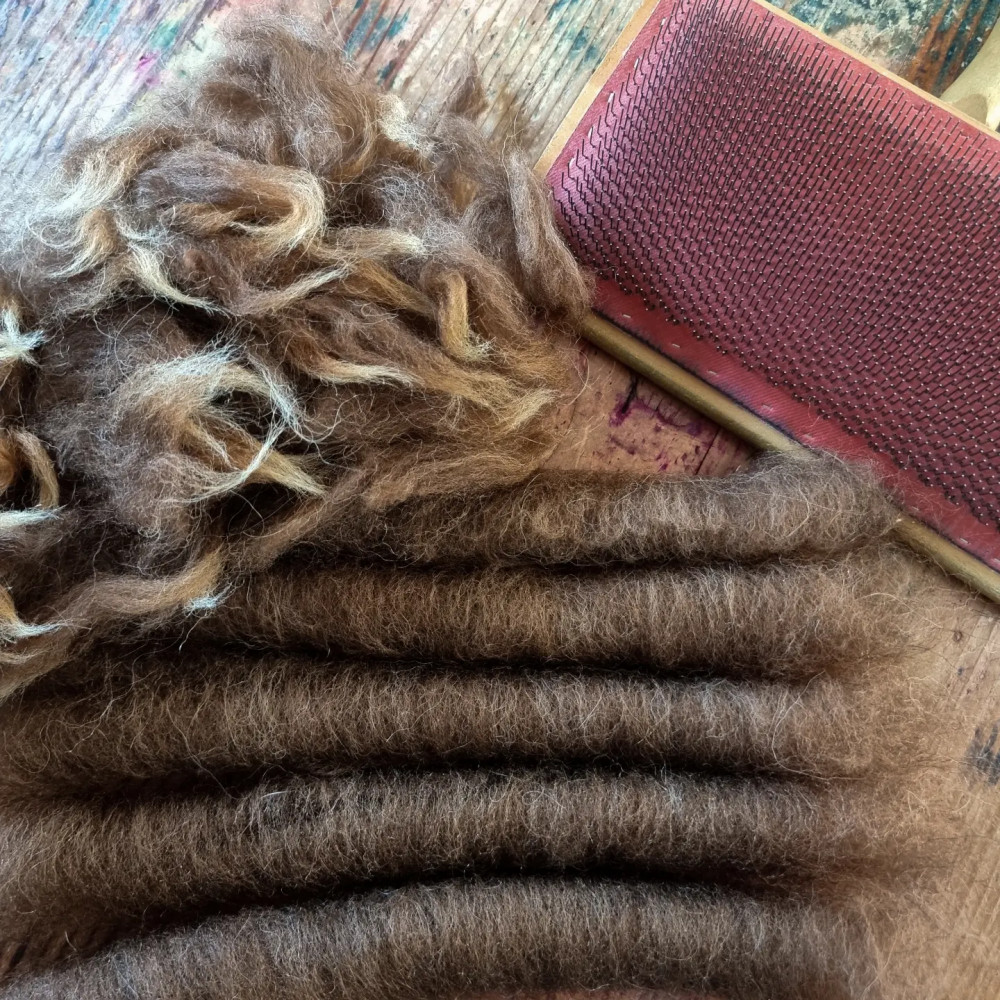 Optional, aber sehr hilfreich können sein: ein Diz, 2 Rundhölzer (8-10mm, etwa 40cm lang) zum Drehen von Rolags, Klammern zur Befestigung eines Wollkammes am Tisch oder eine Tischstation.
