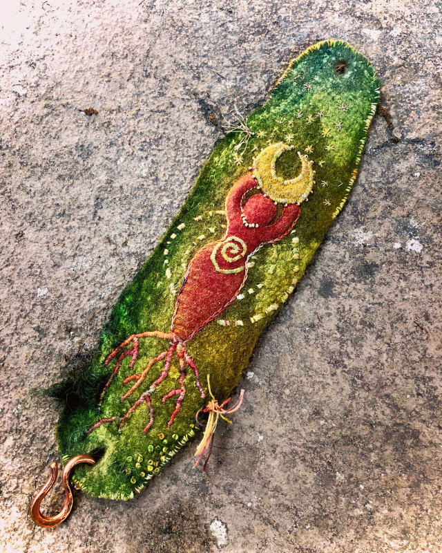Dieses wird mit einem erstellten Vorfilz als Relief auf einem Hintergrund zunächst mit der Filznadel aufgefilzt. Der Hintergrund wird mit Seide, Stoffstückchen, Spitze, Wolllocken….u.s.w. gestaltet. Das Motiv kann mit der Schablonentechnik noch ergänzt oder betont werden. Wer möchte, hat die Möglichkeit das fertige Stück noch ganz oder teilweise zu überfärben. Hierbei können sehr spannende Farbverläufe oder Schattierungen mit mehr Tiefe entstehen. Anschließend schmücken wir das Motiv mit freier Stickerei und lassen uns dabei vom Zufall und Beobachtungen inspirieren, im Hintergrund noch mehr zu entdecken was ins Leben gerufen werden möchte.