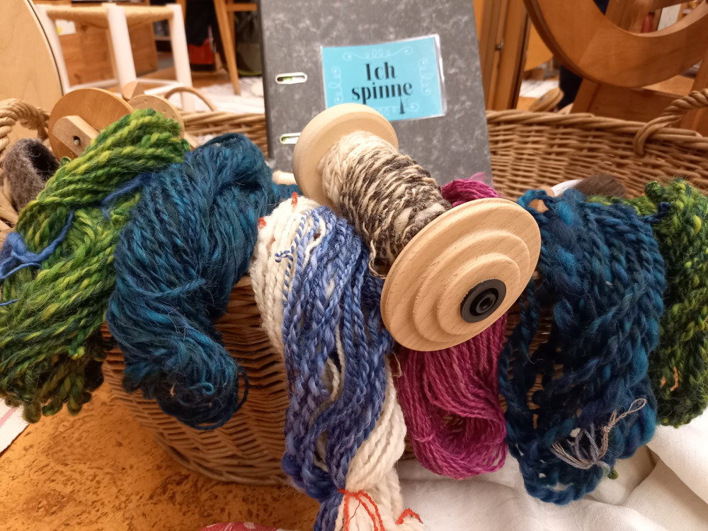Handspindel und Spinnrad können im Kurs von Filzrausch kostenfrei ausgeliehen werden.