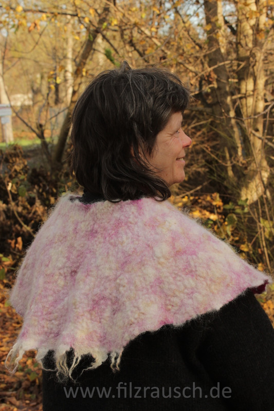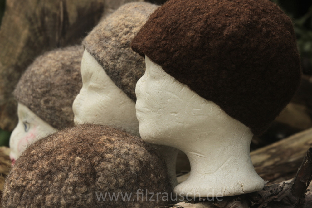 Jede Rohwolle ist in ihrer natürlichen Lockigkeit einzigarig und je nach Filzfähigkeit und Kräuselung entweder pur oder mit kardierter Wolle als Basis einsetzbar. Wir wollen in diesem Kurs, aufbauend auf ersten Proben, einen kleineren Umhang/ Kragen und/ oder einen Hut/ Haube herstellen, je nach Wolle eher flauschig fellig oder strukuriert.